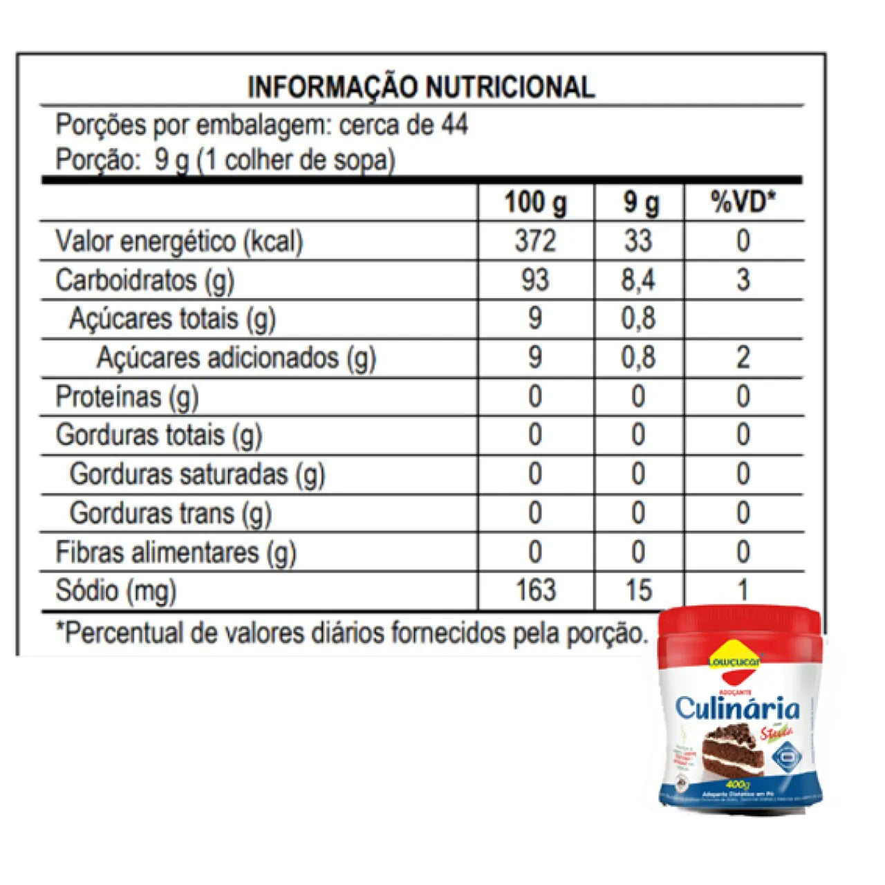 Ingredientes: Maltodextrina; Edulcorantes Artificiais Ciclamato de Sódio e Sacarina Sódica; Edulcorantes Naturais Glicosídeos de Steviol; Antiumectante Dióxido de Silício.