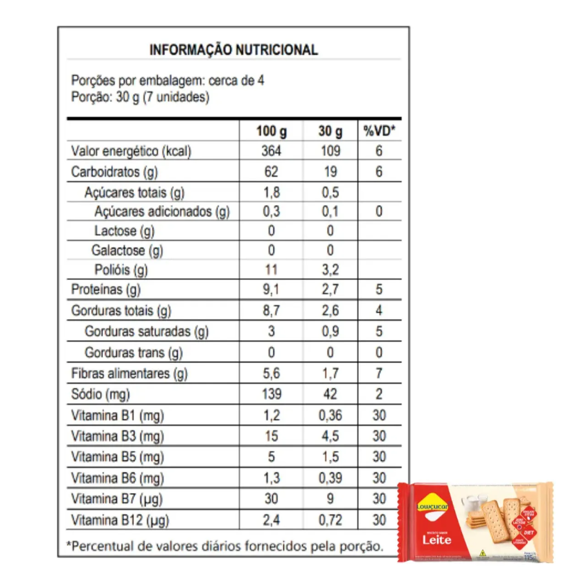 Farinha de trigo enriquecida com ferro e ácido fólico; maltodextrina; farinha de milho; gordura vegetal; vitaminas: B1 (Tiamina), B3 (Niacina), B5 (Ácido Pantotênico), B6 (Piridoxina), B7 (Biotina) e B12 (Cianocobalamina); extrato seco de malte; umectantes: sorbitol e polidextrose; fermentos químicos: bicarbonato de amônio, bicarbonato de sódio, difosfato dissódico; edulcorante: naturais xilitol e glicosídeos de steviol e artificial sucralose; emulsificante lecitina de soja *; antiumectante carbonato de cálcio; corante caramelo IV; aromatizantes; melhorador de farinha metabissulfito de sódio. ALÉRGICOS: CONTÉM DERIVADOS DE TRIGO, SOJA E CEVADA. PODE CONTER AVEIA E CENTEIO. CONTÉM GLÚTEN.