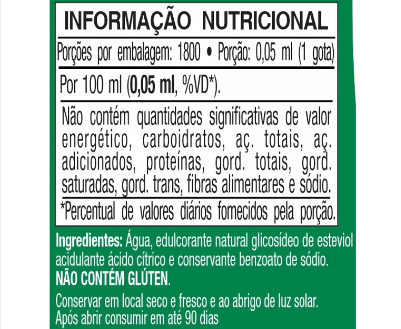 Ingredientes: Água, steviosídeo e conservante Sorbato de potássio